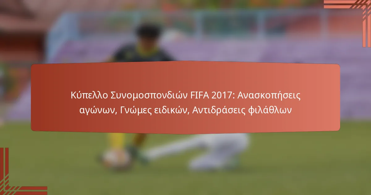 Οι απόψεις των ειδικών σχετικά με το Κύπελλο Συνομοσπονδιών FIFA 2017 ανέδειξαν στρατηγικές καινοτομίες, εξαιρετικές επιδόσεις παικτών και τις επιπτώσεις των αποτελεσμάτων των αγώνων για μελλοντικά τουρνουά. Οι αναλυτές παρείχαν πληροφορίες σχετικά με τις τακτικές των ομάδων και τις αξιολογήσεις των παικτών, οι οποίες μπορούν να ενημερώσουν τις προσδοκίες για τους επόμενους διαγωνισμούς.