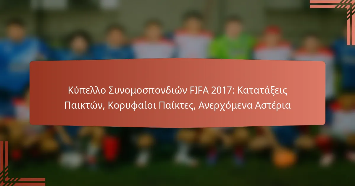 Το Κύπελλο Συνομοσπονδιών FIFA 2017 ανέδειξε εξαιρετικά ταλέντα, με τις κατατάξεις των παικτών να αντικατοπτρίζουν τις ατομικές επιδόσεις μέσω βασικών μετρήσεων όπως γκολ, ασίστ και αμυντικές συνεισφορές. Ξεχωριστοί παίκτες αναδείχθηκαν ως κορυφαίοι επιδόσεις, προσφέροντας εντυπωσιακά στατιστικά και κρίσιμες ενέργειες σε καθοριστικούς αγώνες. Επιπλέον, το τουρνουά παρουσίασε νέους αστέρες που ανέβασαν τα προφίλ τους στη διεθνή σκηνή, επιδεικνύοντας τις ικανότητές τους και ξεπερνώντας τις προσδοκίες.