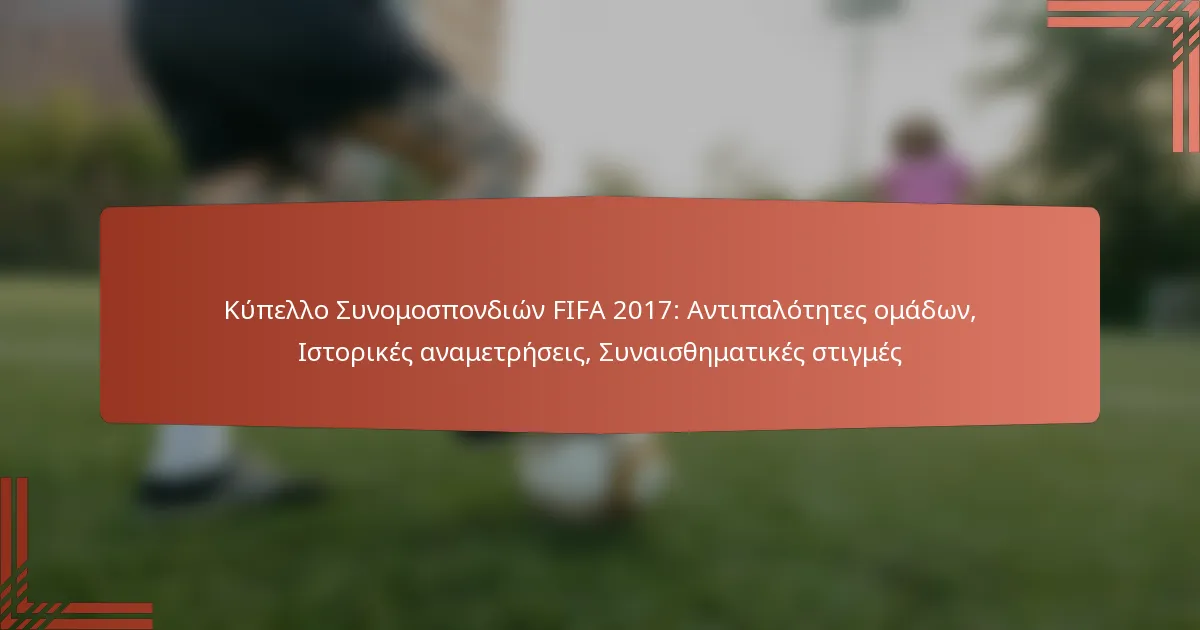 Το Κύπελλο Συνομοσπονδιών FIFA 2017 ήταν μια συναρπαστική επίδειξη έντονων αντιπαλοτήτων μεταξύ ομάδων, βαθιά ριζωμένων σε ιστορικές συναντήσεις και προηγούμενους αγώνες Παγκοσμίου Κυπέλλου. Έθνη όπως η Γερμανία, η Χιλή και η Αυστραλία αντιμετώπισαν ο ένας τον άλλο σε αξέχαστες συγκρούσεις που όχι μόνο ανέδειξαν το ανταγωνιστικό τους πνεύμα αλλά και δημιούργησαν συναισθηματικές στιγμές που αντήχησαν στους φιλάθλους και τους παίκτες.